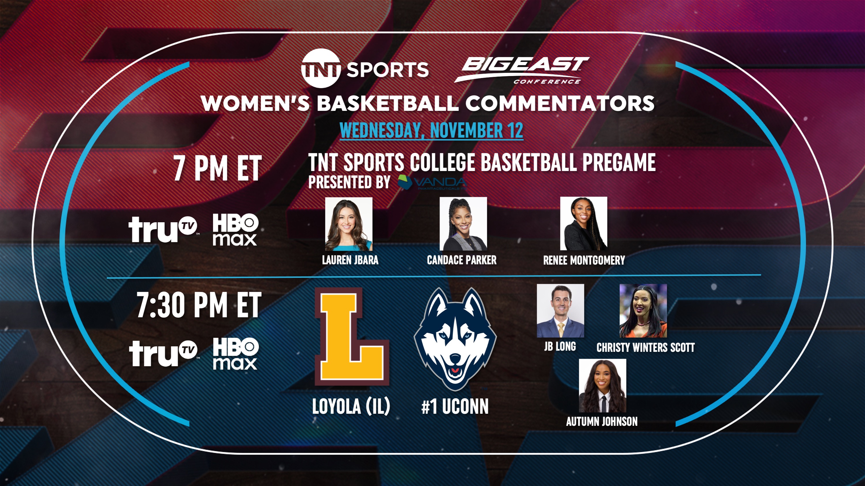TNT Sports College Basketball Pregame presented by Vanda Pharmaceuticals will start at 7 p.m., featuring Women's Basketball Hall of Fame Class of 2026 Inductee Candace Parker, two-time WNBA champion and 2009 NCAA champion Renee Montgomery, and versatile sportscaster Lauren Jbara, who collectively will lead TNT Sports women’s basketball studio coverage this season.