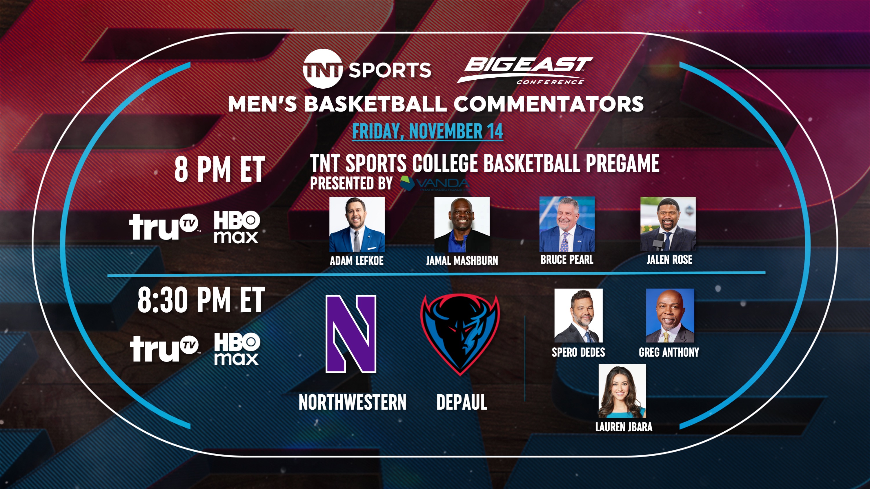 The DePaul Blue Demons will take on the Northwestern Wildcats at 8:30 p.m. on Friday, November 14 on truTV and HBO Max. Pregame coverage will begin at 8 p.m. with Bruce Pearl, Jalen Rose, Jamal Mashburn and host Adam Lefkoe. Spero Dedes and Greg Anthony will call the game, with reporting from Lauren Jbara.