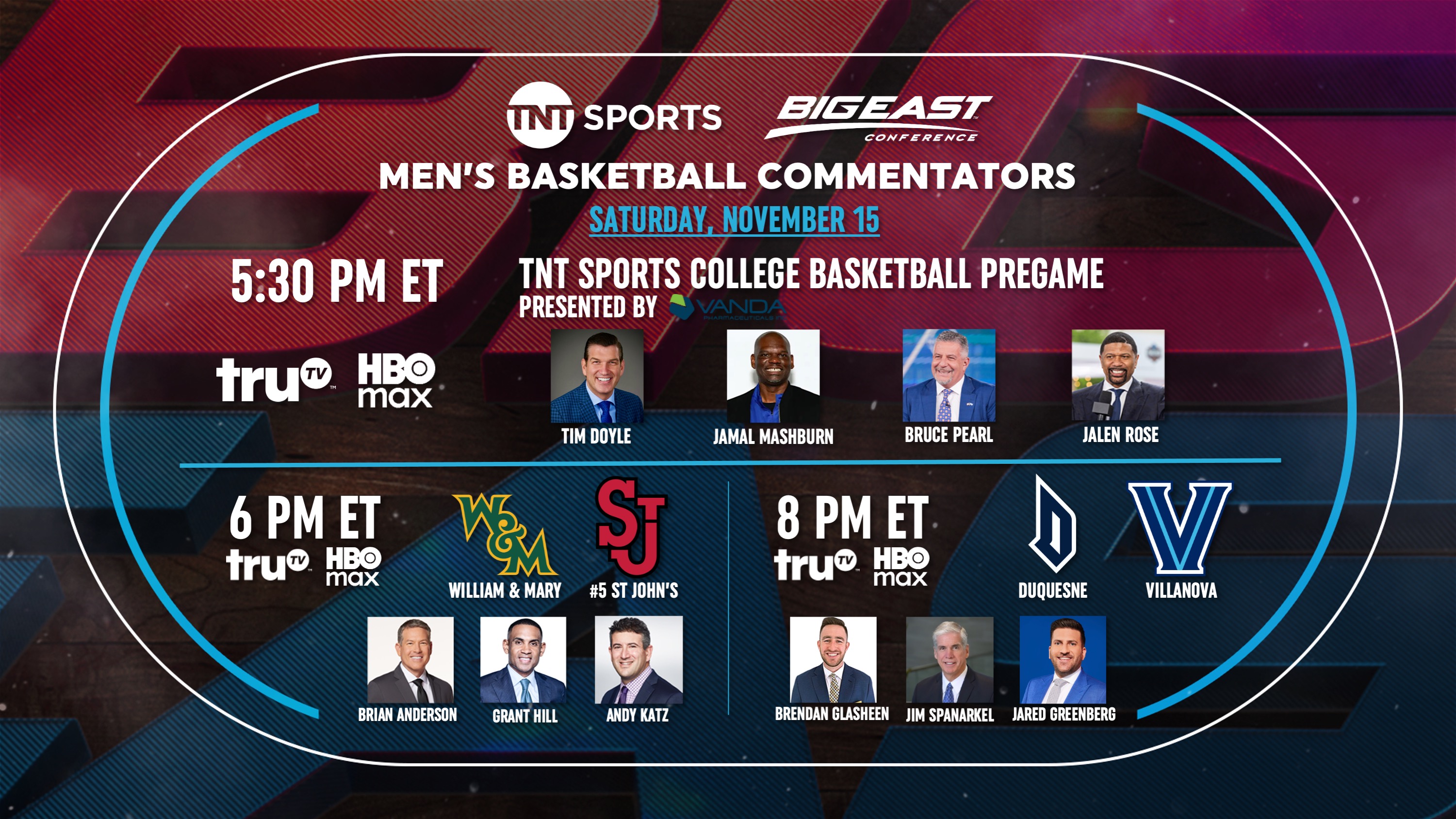 Later at 8 p.m., the Villanova Wildcats will welcome the Duquesne Dukes to Finneran Pavilion for a primetime matchup. Brendan Glasheen, Jim Spanarkel and Jared Greenberg will be on the call for the game. Pregame coverage will begin at 5:30 p.m. with Pearl, Rose, Mashburn, and host Tim Doyle, who will contribute regularly to TNT Sports’ studio coverage this season.